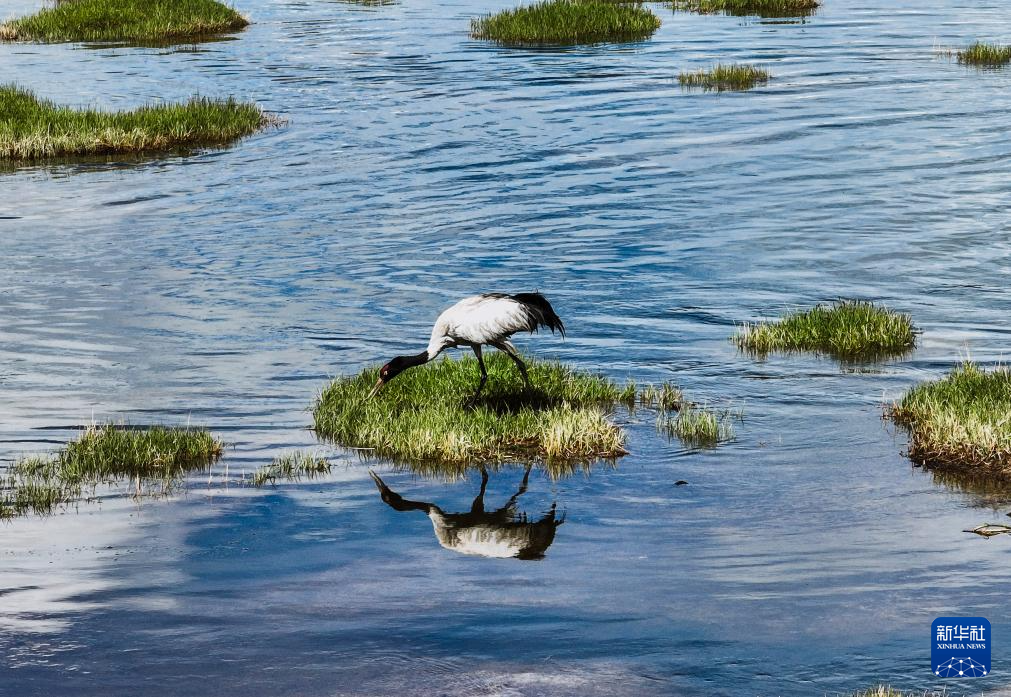 這是6月4日在青海隆寶國家級自然保護區拍攝的黑頸鶴(無人機照片)。新華社發(杜笑微攝)