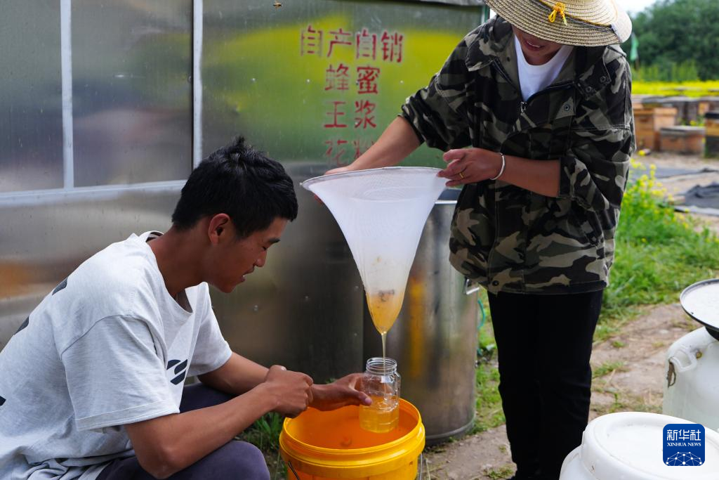 7月16日,在青海省海北藏族自治州門源回族自治縣,廖春容與吳昊過濾新鮮蜂蜜。新華社記者 齊芷玥 攝