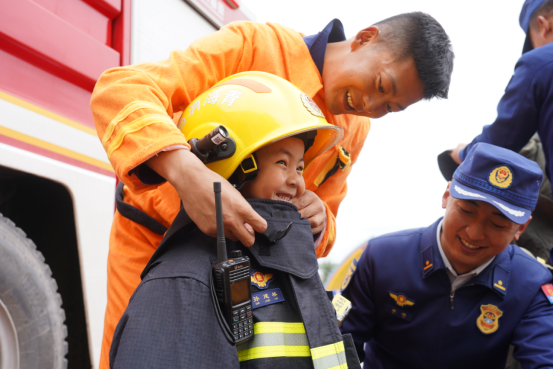 9月3日,果洛藏族自治州消防救援支隊宣傳員在瑪沁縣大武幼兒園開展消防安全開學第一課,圖為小朋友體驗穿著滅火戰斗服。(青海省消防救援總隊供圖)