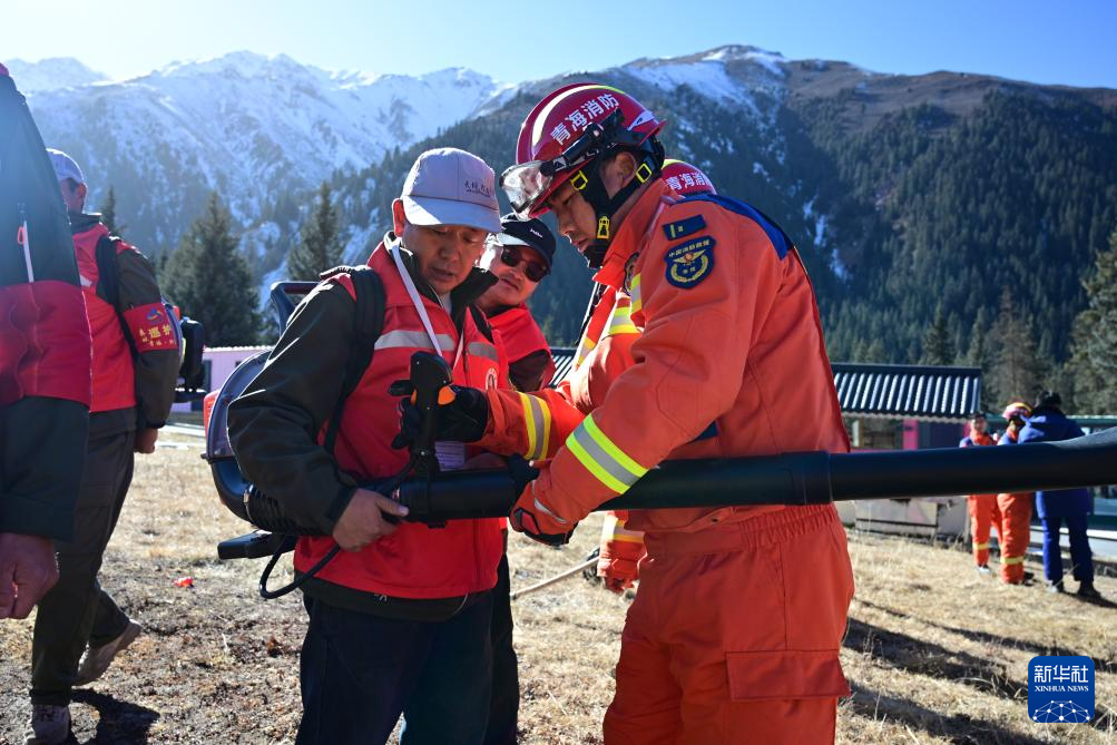 11月8日,在青海省海北藏族自治州祁連縣阿咪東索林區,祁連縣消防救援大隊消防員(右一)指導當地護林員使用森林草原滅火救援裝備。